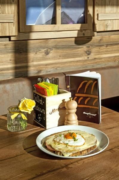 Bauernbrot mit Schinken, Bergkäse und Spiegelei